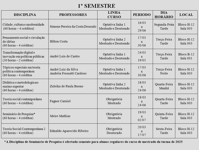 Horários das Aulas